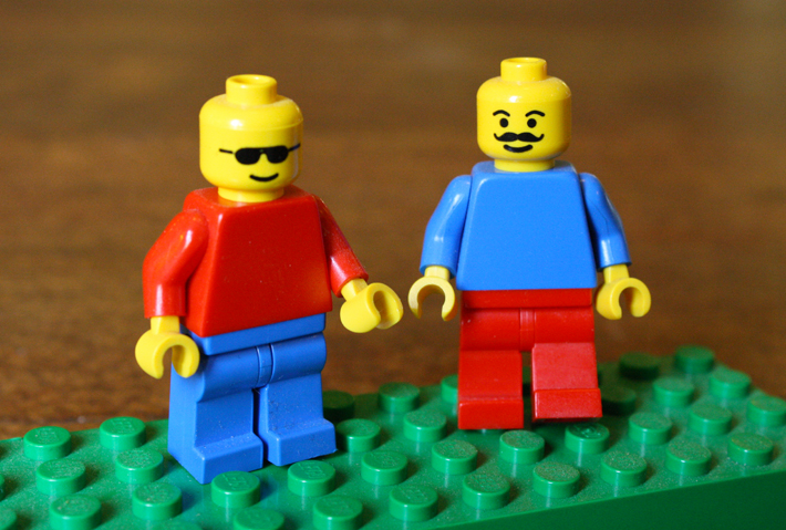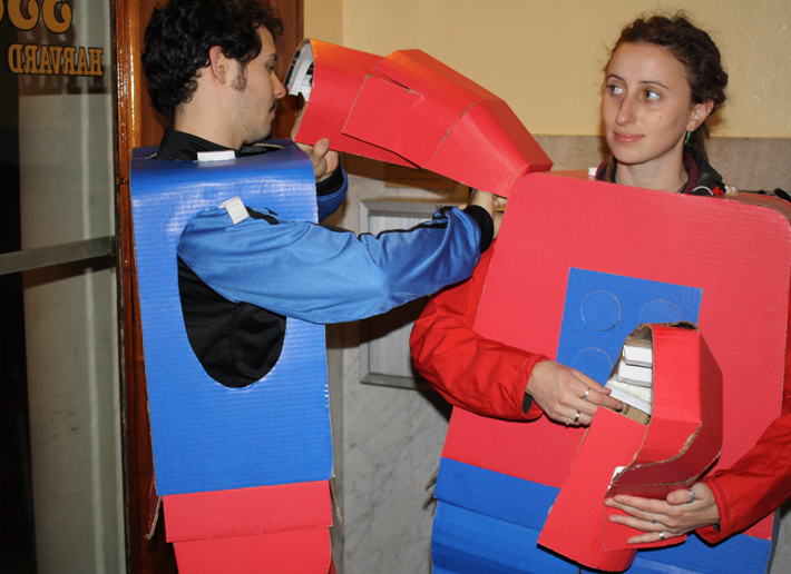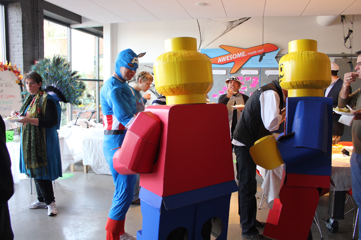 An example of form and function with simple, inexpensive materials, these human scaled LEGO minifigure Halloween costumes were made with cardboard, foam core, hot glue, papier-mâché, tape, and love. Inexpensive prototypes and models can tell a great story.